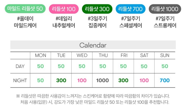 리들샷의 숫자가 100, 300, 700으로 올라갈수록 효과가 좋다고 할 수 있지만, 그만큼 자극도 커지므로 본인에게 알맞는 제품을 고르는 것이 중요할 것 같습니다.