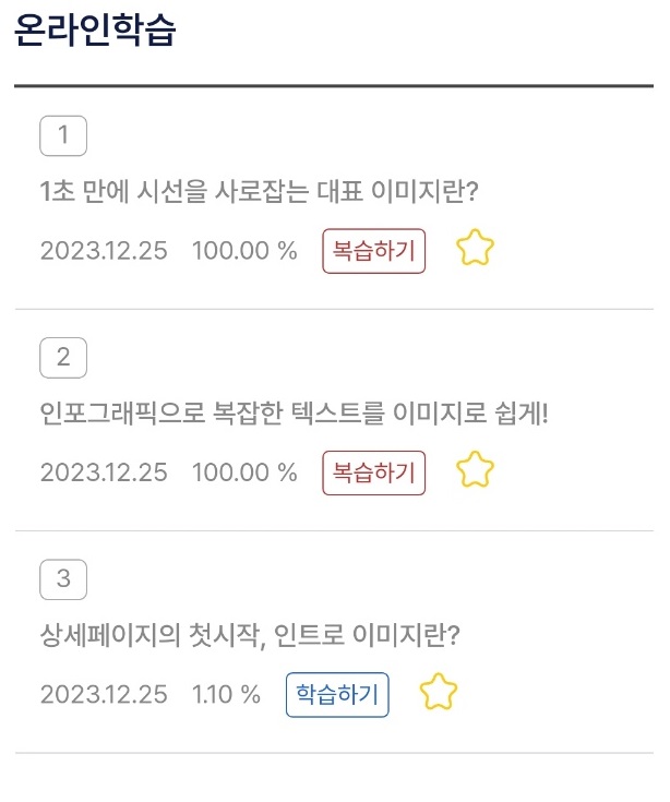 제가 선택한 교육은 한개의 온라인 교육 안에 3개의 교육이 들어 있었고, 3개의 교육을 모두 들어야 수료가 되었어요.